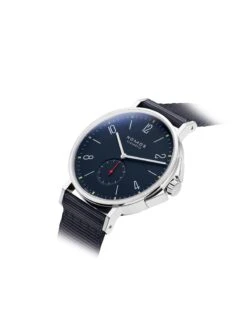 It’ s simply suitable always and everywhere. The NOMOS Glashütte Ahoi Atlantik with the Ref. 557 neither shies away from a stylish appearance nor from adventurous challenges and combines a clear design with extreme robustness. Inside the 40-millimeter stainless steel case, which is water-resistant to 200 meters, it boasts a deep blue dial with a small seconds subdial, on which the white typography and the yellow-filled hour markers provide a rich contrast. In addition, Superluminova makes the hands and numerals glow underwater and in low-light conditions. Self-winding caliber NOMOS DUW 5001 reliably ticks inside the case. A fast-drying, dark blue textile strap rounds off the sporty and elegant design of this maritime all-rounder.