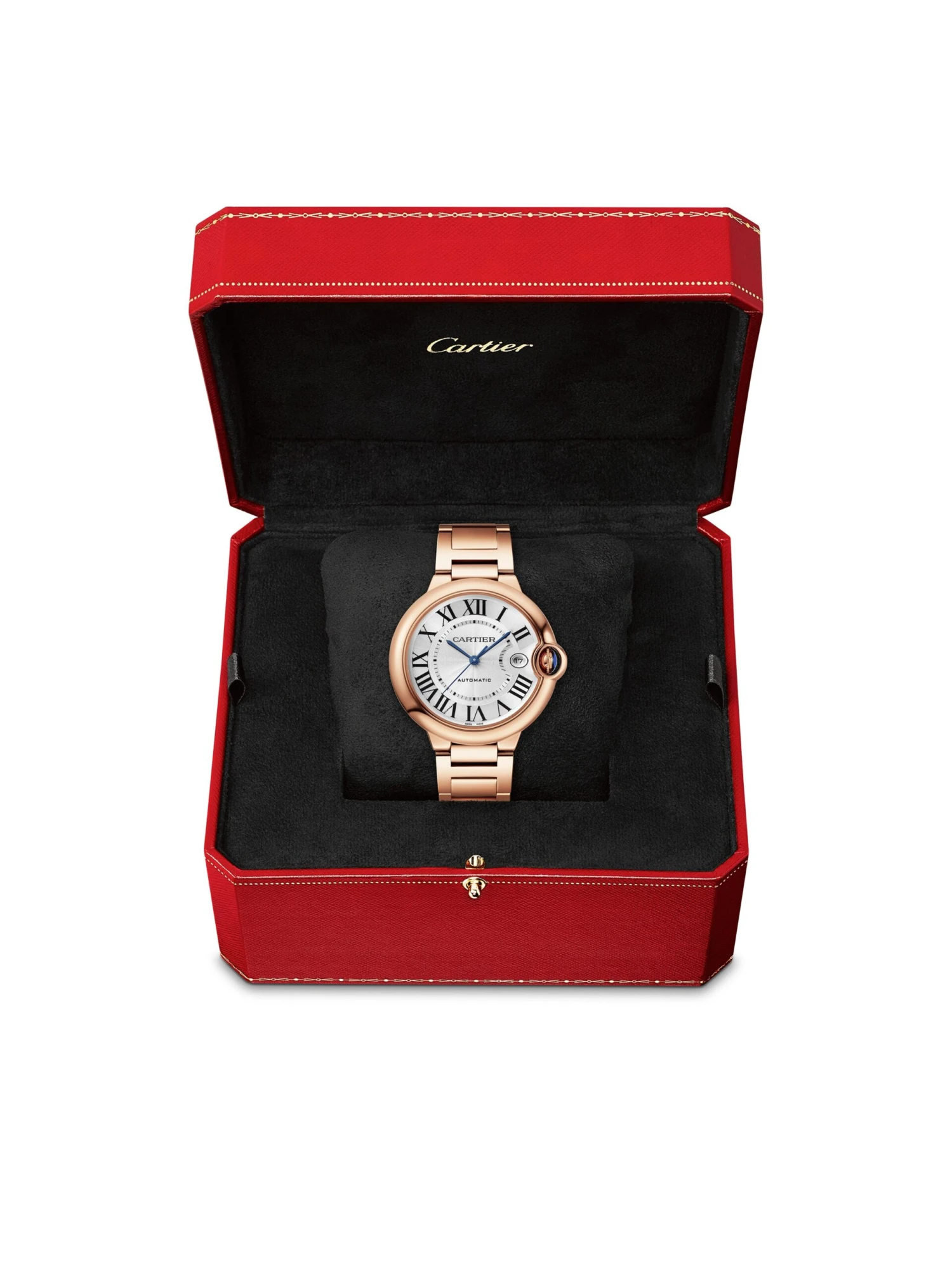 Ballon Bleu de Cartier watch, 40 mm, Manufacture mechanical movement with automatic winding, caliber 1847 MC. 18K rose gold (750/1000) case, fluted crown set with a sapphire cabochon, silvered guilloché dial, blued-steel sword-shaped hands, sapphire crystal, 18K rose gold (750/1000) interchangeable bracelet, calendar aperture at 3 o’clock. Thickness: 12.4 mm. Water-resistant up to 3 bar (approx. 30 meters/100 feet).