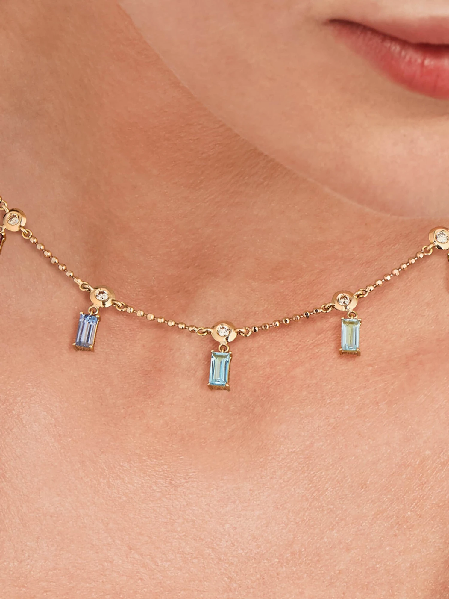 The Blu Colors BY KIM necklace is the perfect splash of color for the coming summer, combining femininity with coolness. The nine baguette-cut colored gemstones are reminiscent of a rainbow in their splendor of color. Each of them drips down from small cinnamon-colored brilliant-cut diamonds, which in turn are linked by a glittering bead chain made of 18k rose gold. This is a composition of contrasts of round and square that lends the design a casual, modern touch.