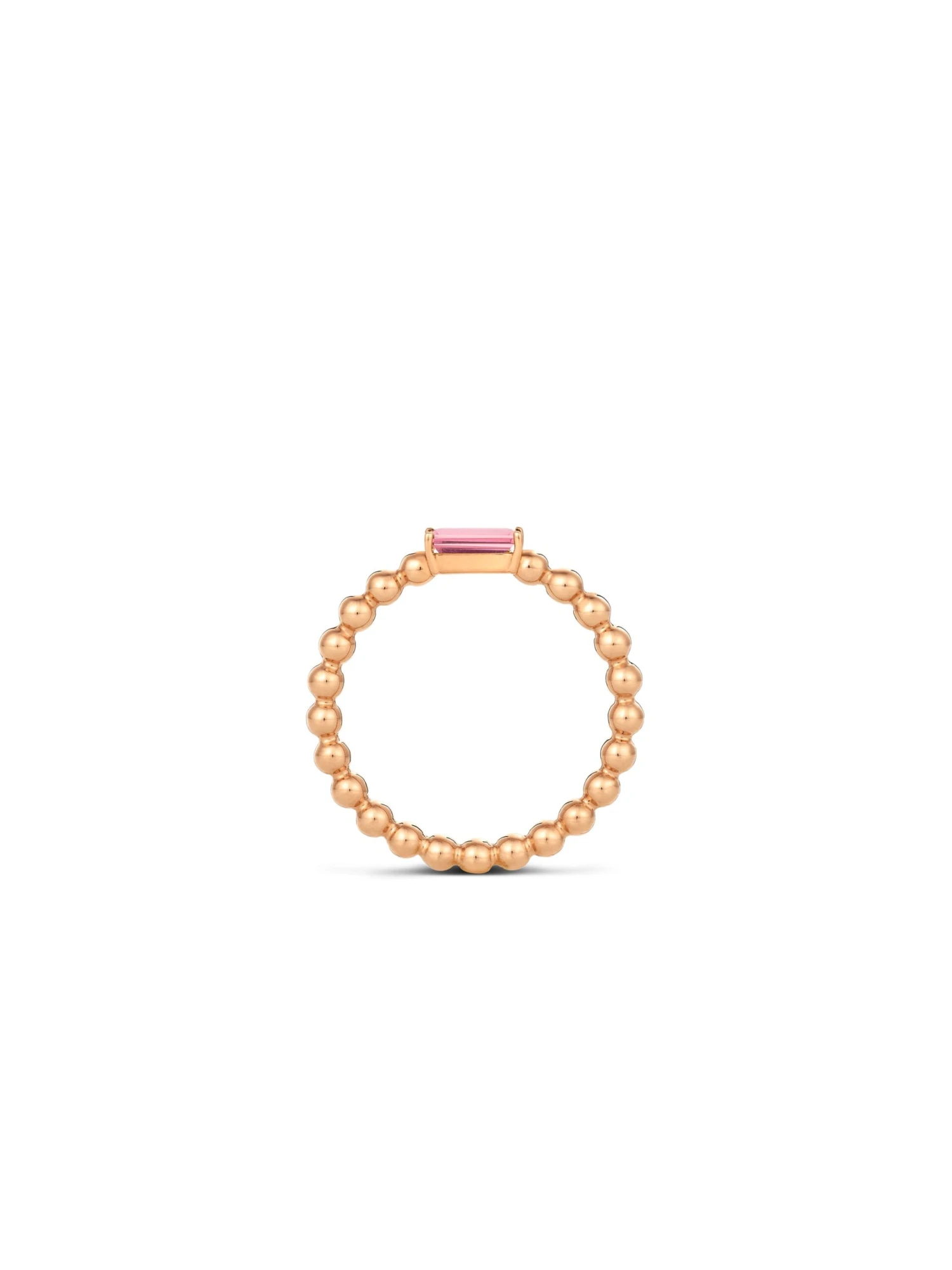 The filigree Blu Colors BY KIM ring blends femininity with an air of coolness and is the perfect companion for everyday wear. The slender row of spherical elements made of 18k rose gold is perfect for combining with other rings, giving even long-standing favorites a colorful update. The straightforward baguette cut of the rose-colored tourmaline set in filigree prongs gives this ring its hip touch.