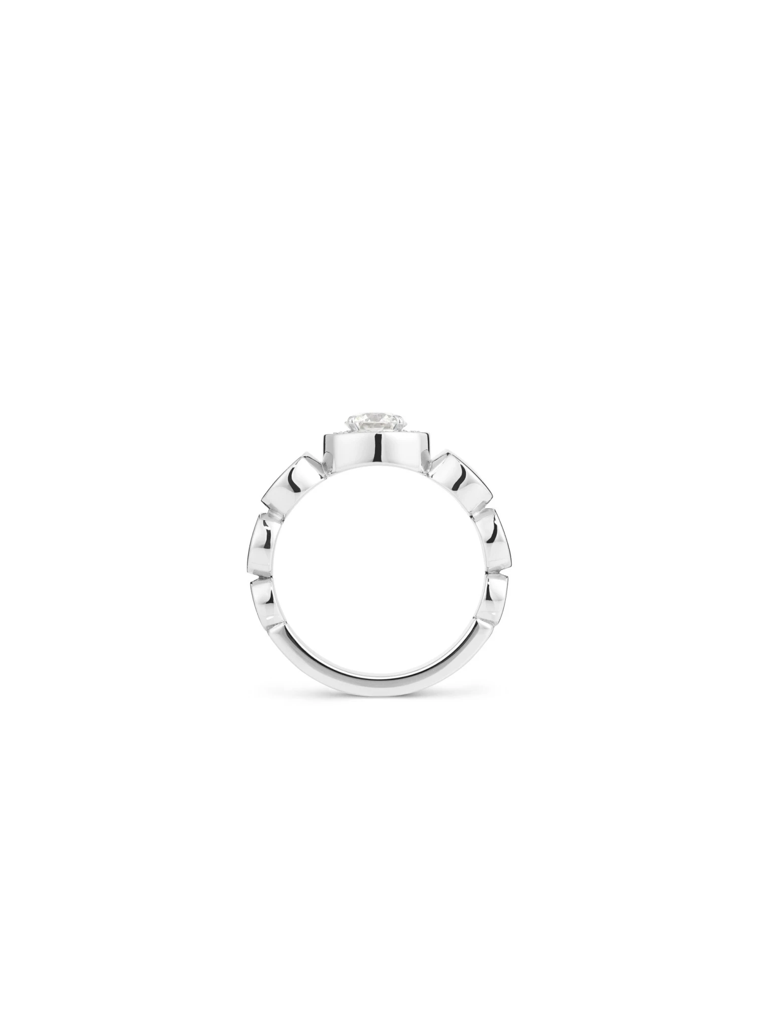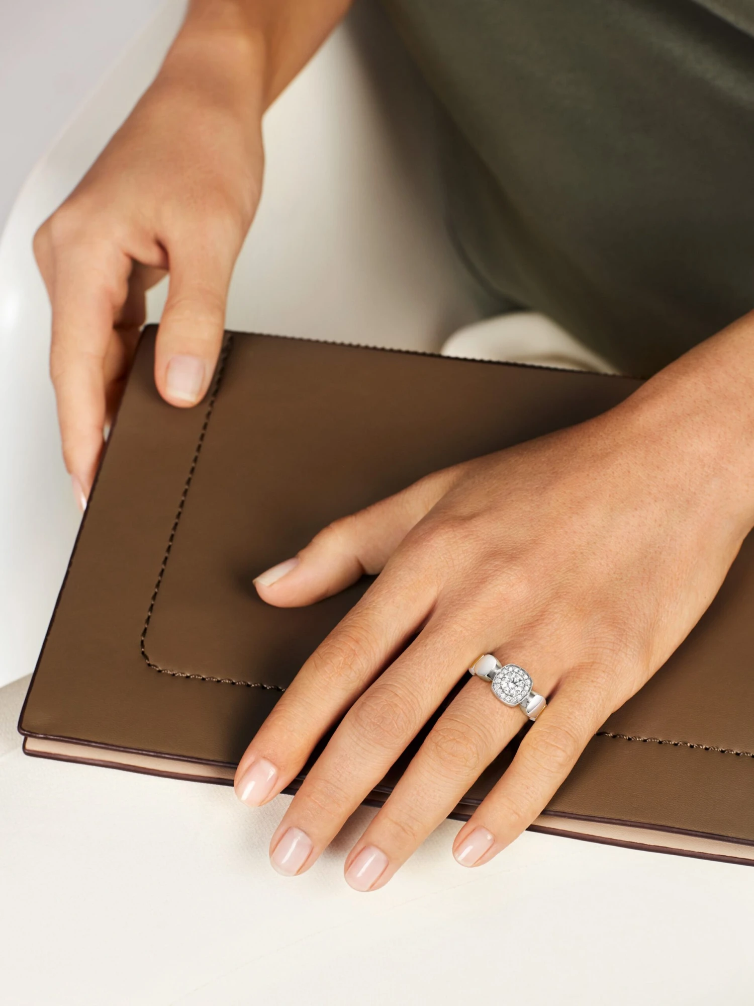 A brilliant-cut diamond with 0.50 ct, encircled by another 16 brilliant-cut diamonds, is clearly the heart of the Blu Square BY KIM ring. The slightly flattened cushion-formed elements in 18k white gold offer unique wearing comfort and are perfectly graduated in sizes. A very special interpretation of a half carat for all those looking for something very special.