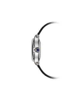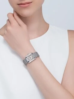 Tank Must watch, large model, high autonomy quartz movement. Steel case, bezel set with 42 brilliant-cut diamonds totaling 0.48 carats, beaded crown set with a synthetic cabochon-shaped spinel, silvered dial, blued-steel sword-shaped hands, interchangeable black brushed calfskin strap, steel ardillon buckle. Case dimensions: 33.7 mm x 25.5 mm, thickness: 6.6 mm. Water-resistant up to 3 bar (approx. 30 meters/100 feet).