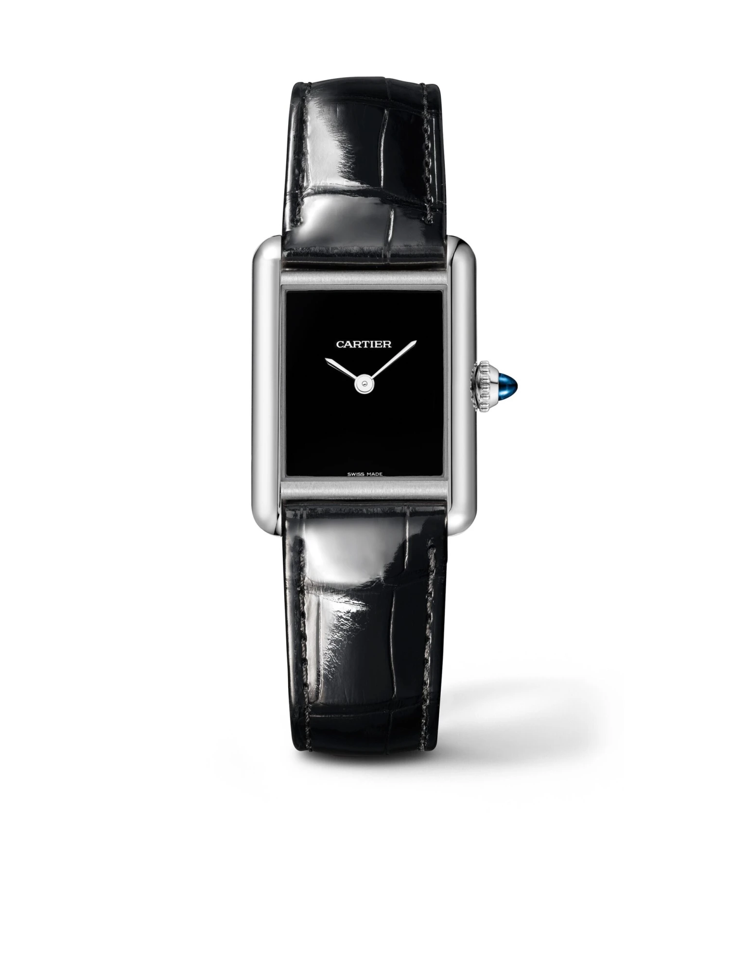 Tank Must watch, small model, quartz movement. Steel case, beaded crown set with a synthetic cabochon-shaped spinel, black lacquered dial, rhodiumized sword-shaped hands, shiny black alligator leather strap, steel ardillon buckle. Case dimensions: 1.2” x 0.9”, thickness: 0.25”. Water-resistant up to 3 bar (approx. 30 meters/100 feet).