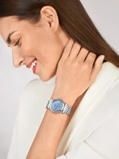 Strictly limited, adorned with the fire of diamonds, and made possible only by the expertise of two long-established companies. The Chopard Happy Sport 36 mm Automatic Signature Collection has made the leap into Wempe’s exclusive line, which pairs the icons of the watch world with many years of knowledge about customers’ expectations and wishes. With a diameter of 36 millimeters, this stainless-steel timepiece has the most popular size for ladies’ watches. A special highlight is the ice-blue dial with sunburst finish and guillochĂ© decoration in the center, on which four diamonds and three royal blue sapphires dance freely between two sapphire crystals. A transparent caseback exposes a precise self-winding movement with a power reserve of up to 42 hours. It does not only reliably control the time and date, but also makes the wearer’s heart beat faster. The Wempe Signature Collection logo and the discreet ” One of 50″ engraving further underscore the exclusivity of this luxury watch, which is water-resistant up to 30 meters. A stainless-steel bracelet with a double-folding clasp that matches the case ensures a secure and comfortable fit, especially on delicate wrists.