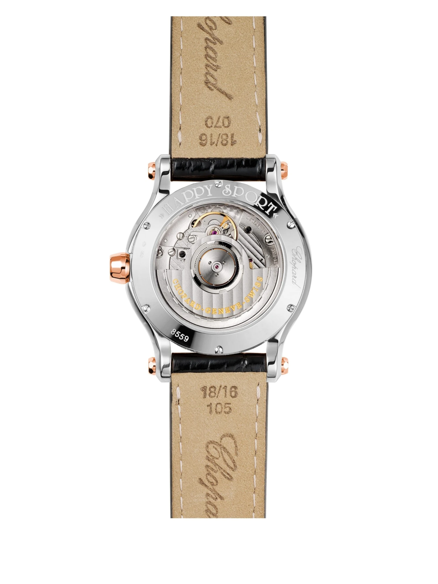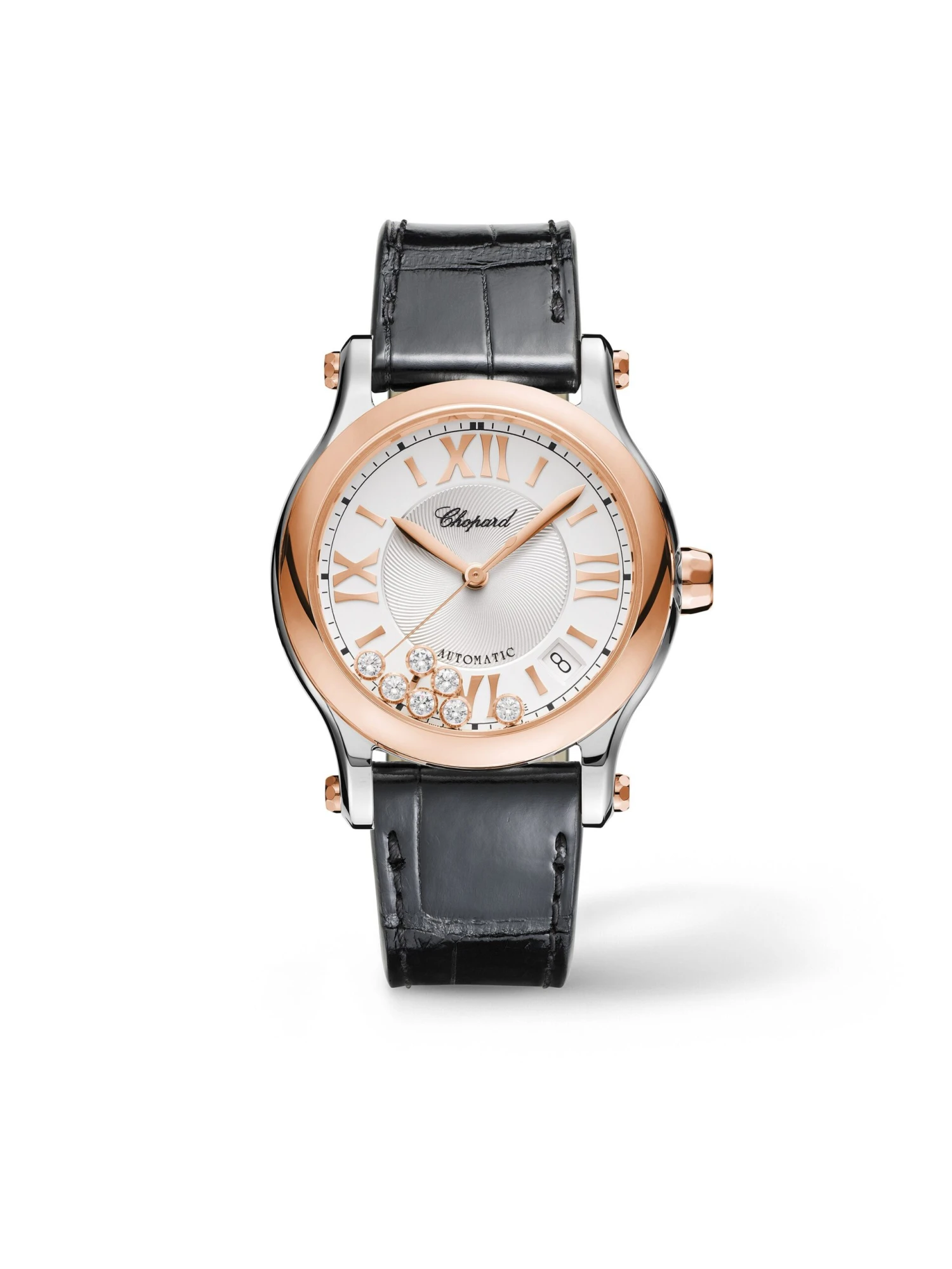 A characteristic feature of the Happy Sport are the movable diamonds that dance as if by magic across the silver-colored dial with guilloche center. This Happy Sport has an 18k rose gold bezel with a diameter of 36 millimeters, a mechanical self-winding movement and a sapphire crystal back. It is water-resistant to 30 meters.