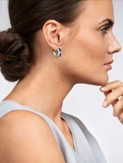 The Colonna Matinée BY KIM earrings captivate by the masterful secret of their unconventional setting and the contemporary combination of different, high-quality materials. The row of individually faceted and precisely aligned black ceramic elements is adorned in its middle by a fine baguette-cut diamond of 0.25 ct that creates further light reflections. Two polished rails of 18k white gold provide the framework for this strong, androgynous ear jewelry.