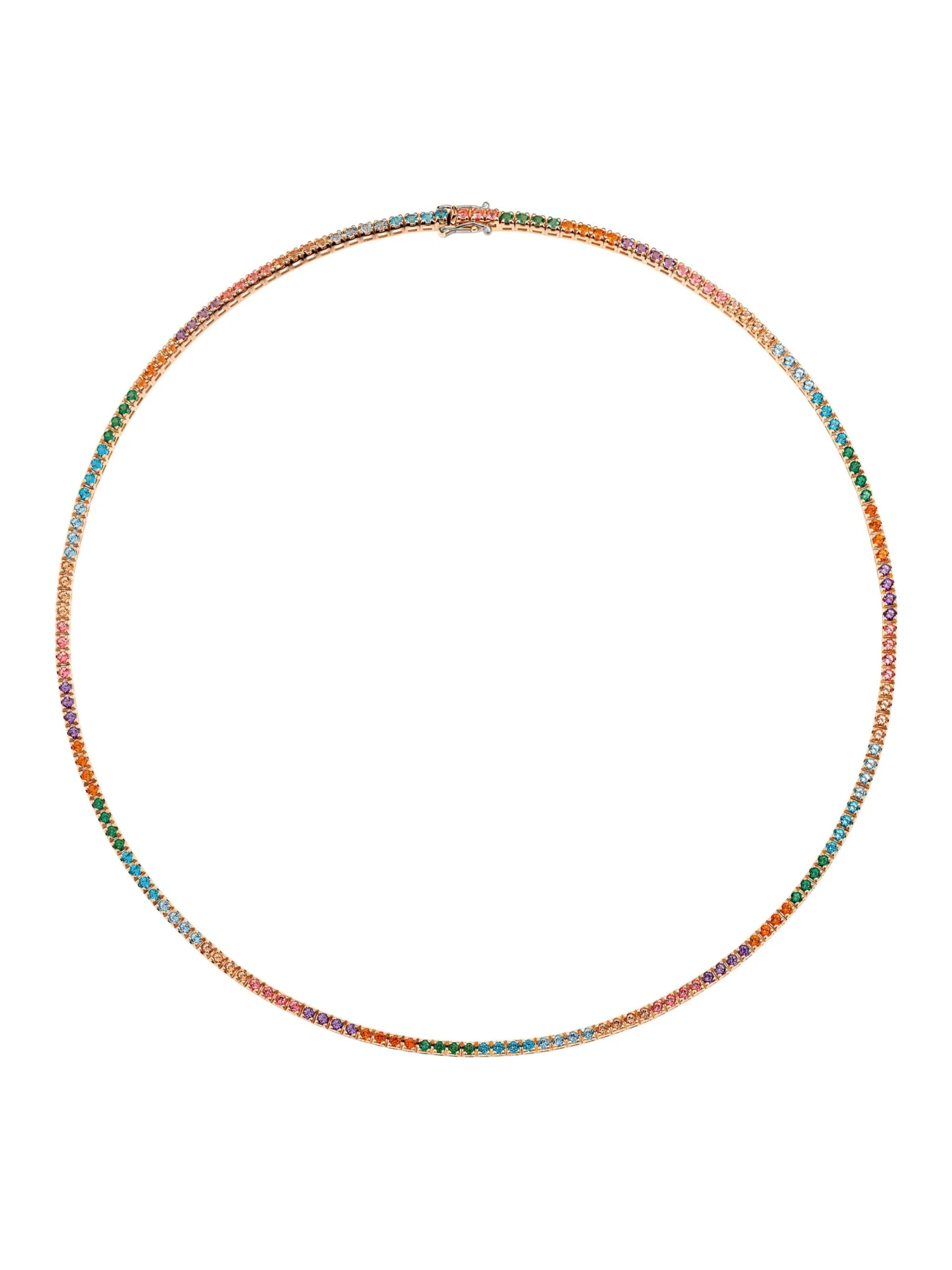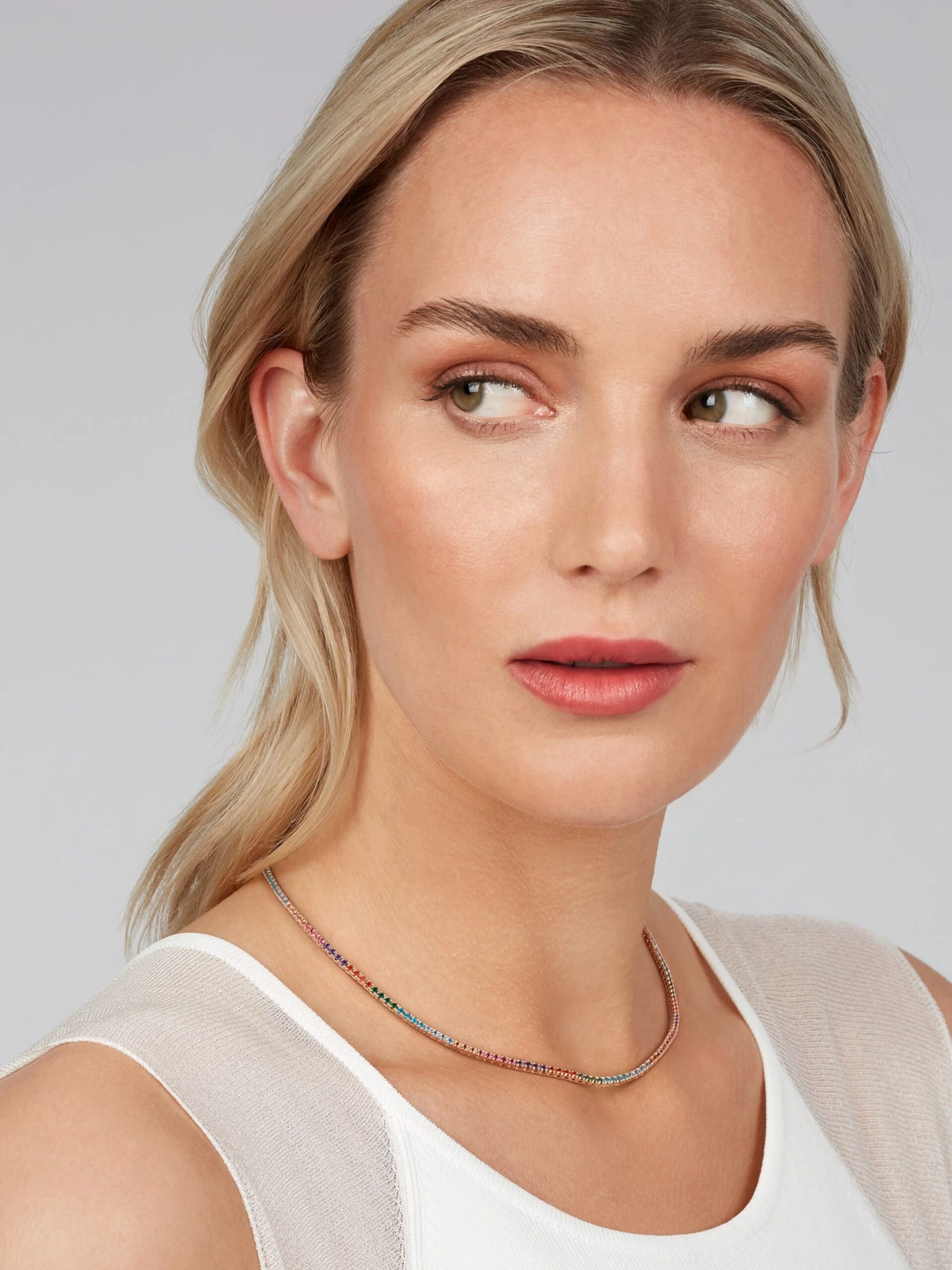 Colorful joie de vivre: The 42 centimeter Electrify by Wempe Casuals necklace fits snugly round the neck and enchants with its colorful lightness of 147 topazes with a total carat weight of 5.50 ct set in warm 18k rose gold. With this necklace we yearn for summer, sun and freedom. Select the matching hoop earrings, bracelet and ring from the joyful collection.
