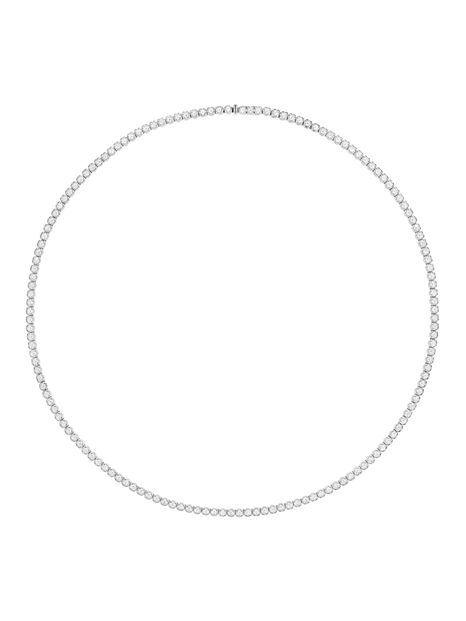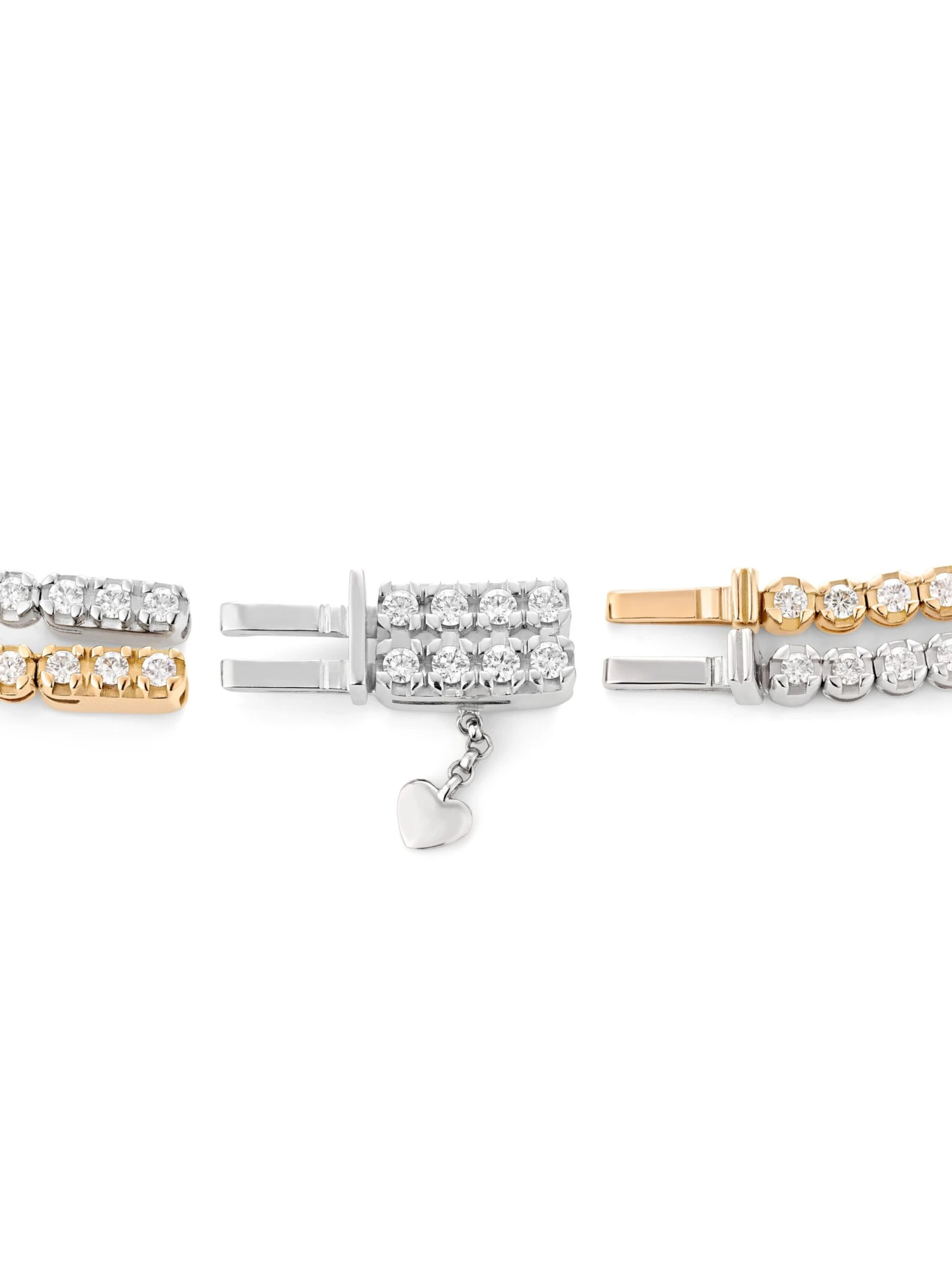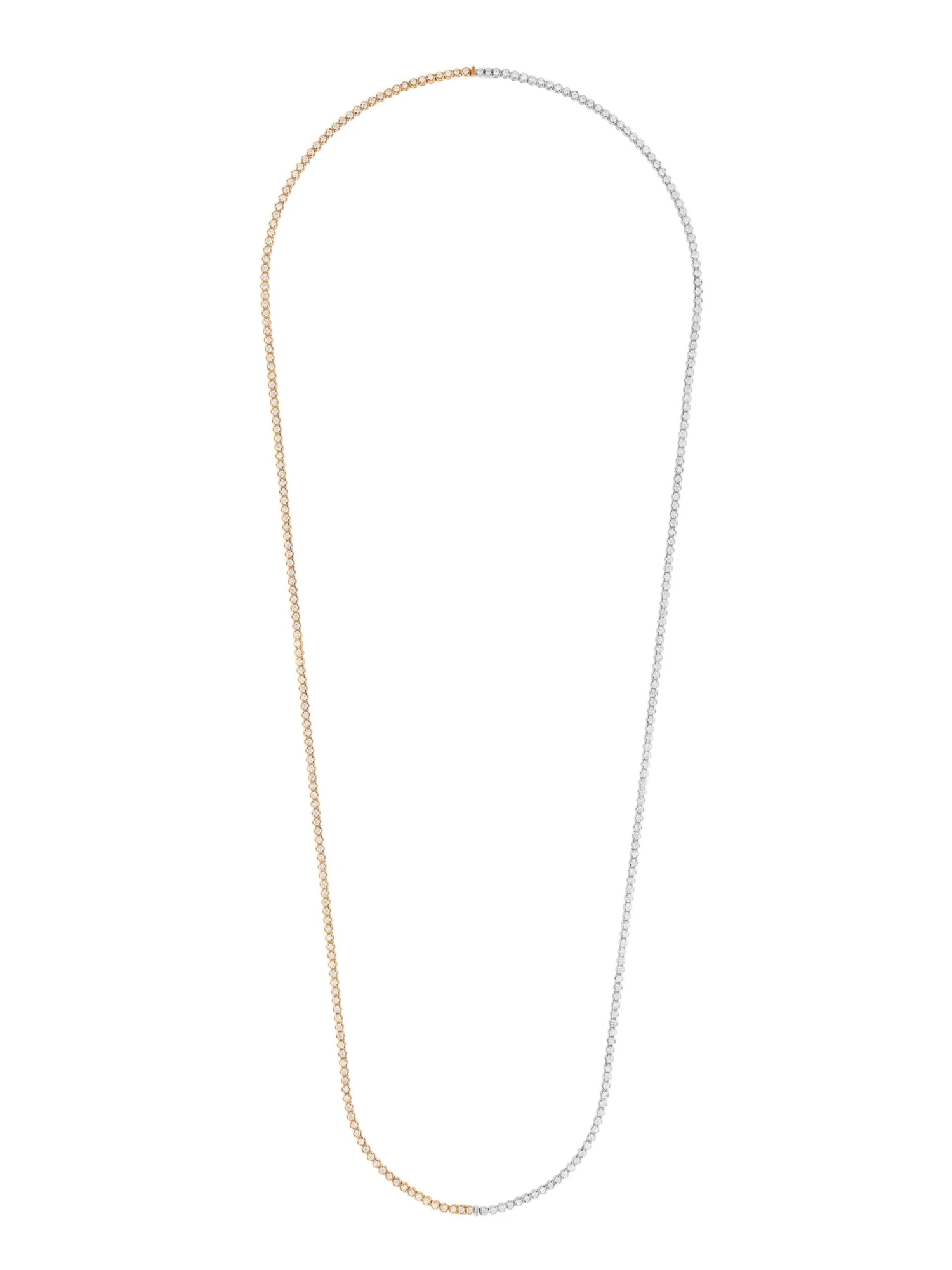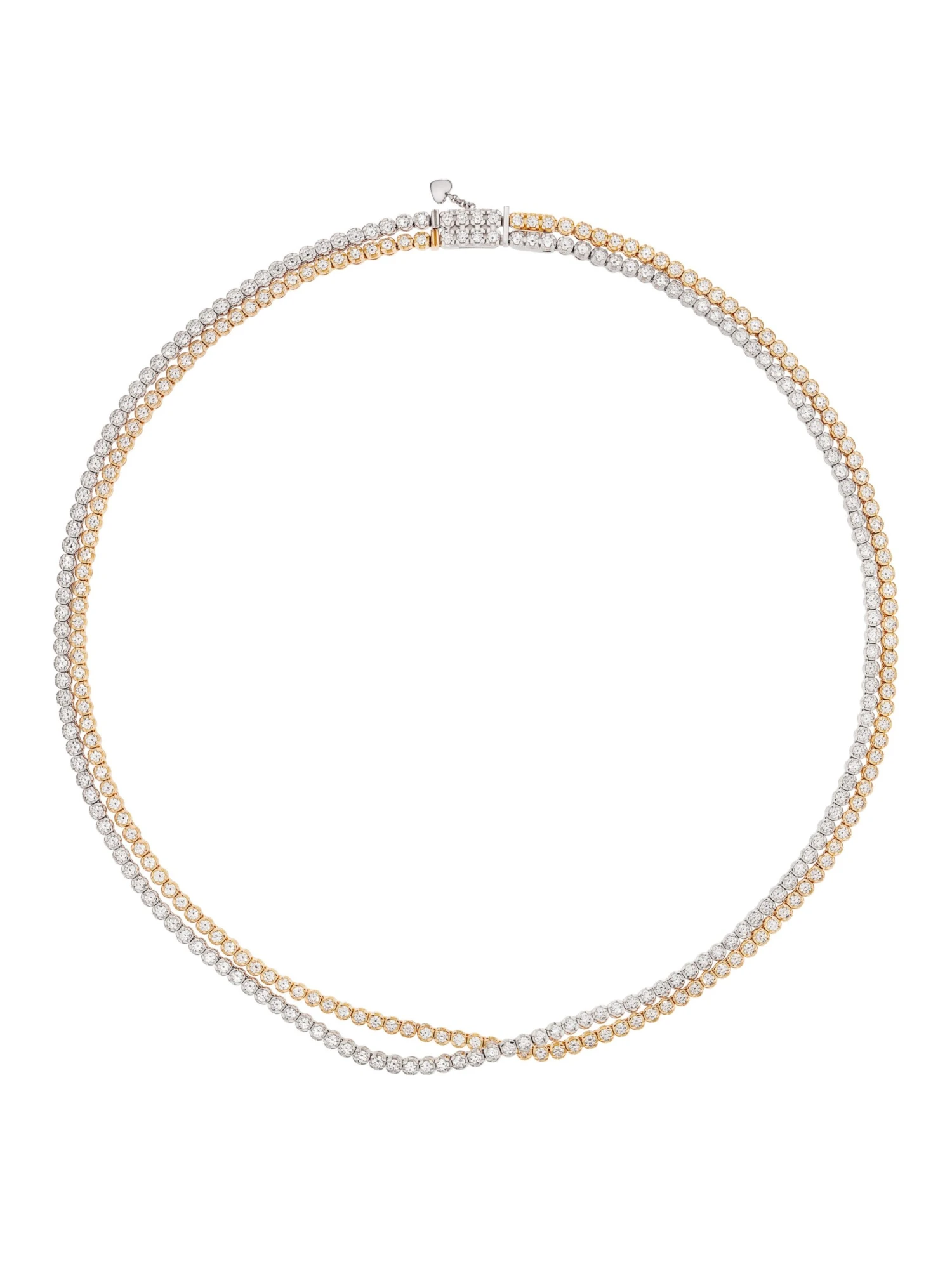 A jewelry piece of superlatives! The exquisite Everloving Renaissance by Wempe Classics Riviรจre necklace combines two elegant necklaces in one and is a decorative touch for any neckline with its five wearing options. A total of 305 prong-set brilliant-cut diamonds of 10.00 ct in total adorn the two necklaces in 18k white and 18k rose gold, which can be worn separately or combined to form a necklace with two parallel or two crossing strands or one long necklace. A luxurious sophistication with a discreet and restrained appearance. A charming detail comes in the form of a small heart pendant near the box clasp, which also features a figure-eight safety catch.