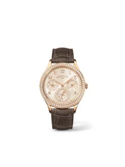 The Ladies First Perpetual Calendar, reference 7140R-001, is made for the sophisticated admirer of mechanics. Thanks to the small dimensions of the 240 Q caliber of legendary thinness – just 3.88 millimeters thick despite its 275 parts and miniature rotor made of 22k gold – the 35.1 millimeter case made of 18k rose gold has a slim profile of 8.7 millimeters. The bezel, set with 68 diamonds, encircles a silver-colored dial with sunray decoration, applied numerals, and minute pearls made of rose gold. It makes for a harmonious presentation of the perpetual-calendar model’s complete offering: day of the week, date, month, leap year, and moon phase, as well as 24-hour indicator with hands.