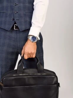 Inspired by the dauntless steel construction workers of the New York skyscrapers from the 1920s, the Wempe Glashütte I/SA Iron Walker collection distinguishes itself by the powerful combination of functionality and precision. The Iron Walker Automatic Chronograph with framed date display, tachymeter scale, and three totalizers is controlled by two pushpieces located directly next to the side protectors of the crown. The 42-millimeter stainless-steel case with a height of 7.90 millimeters is water-resistant to 10 bar and features a blue dial with blue totalizers. The raised steel hour markers and the Super-Luminova® coated hands ensure perfect readability also in the dark.
