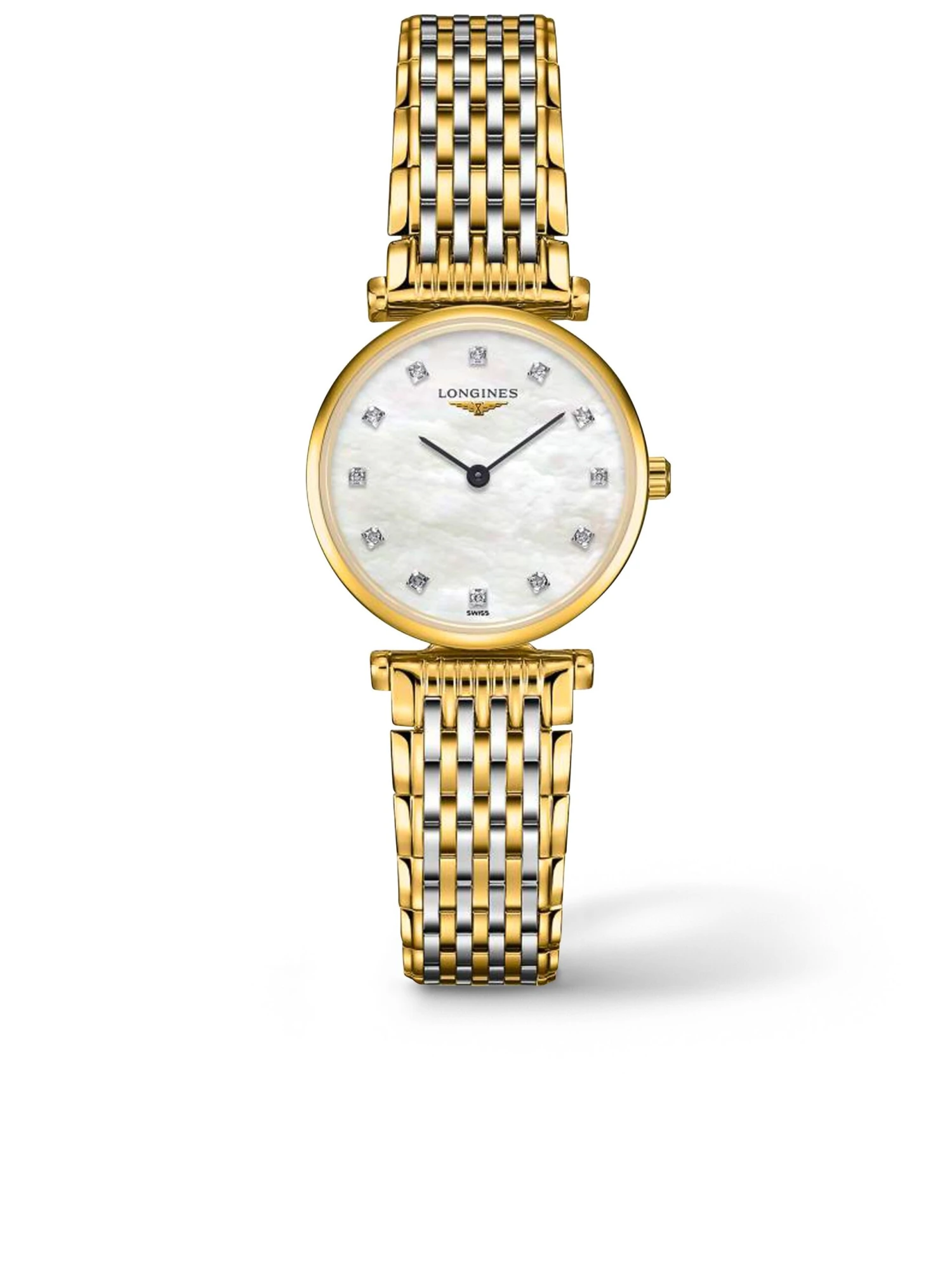 Measuring just 24 millimeters in diameter and featuring a gold-plated stainless steel strap, the Grand Classique is the perfect companion for a truly feminine appearance. The two-handed quartz watch offers discreet elegance with its mother-of-pearl-colored dial and diamond markers.