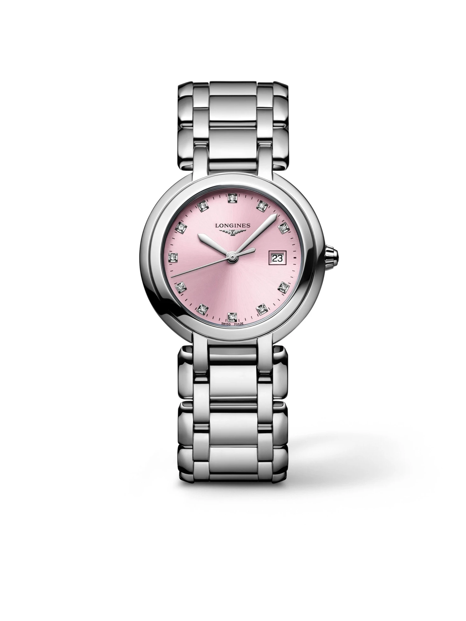 As the name suggests, the Longines Primaluna (Ref. L8.122.4.99.6) is inspired by the moon and its poetry. Made entirely of stainless steel, this ladies’ watch features a pink sunburst dial behind a scratch-resistant sapphire crystal, on which the hours are marked with eleven diamonds. Besides the time, this enchanting timepiece features a date display at three o’clock. The case with a diameter of 30 millimeters houses a precision quartz movement, the caliber L152.