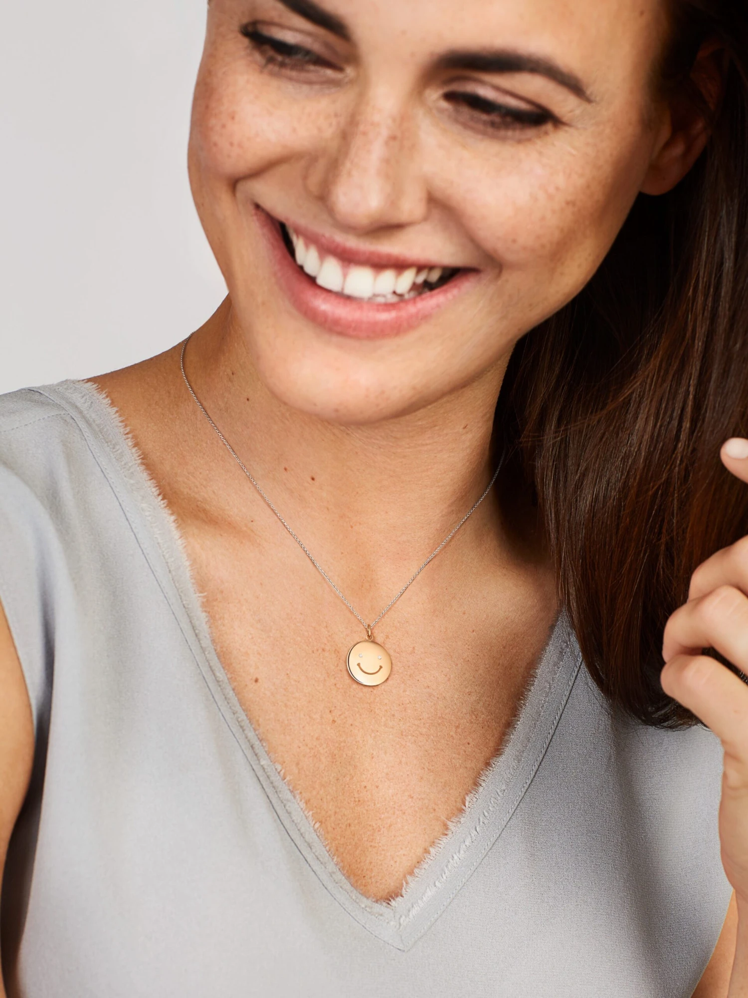 A good mood guaranteed! The Lucky Smiley BY KIM pendant, made of 18 k rose gold, has dazzling eyes formed of two small brilliant-cut diamonds to remind its wearer that there is always a good reason to smile. This playful pendant is worn on a fine cable chain made of 18 k white gold. An ultimate lucky charm, the necklace is a beautiful gift for yourself or your best friend.