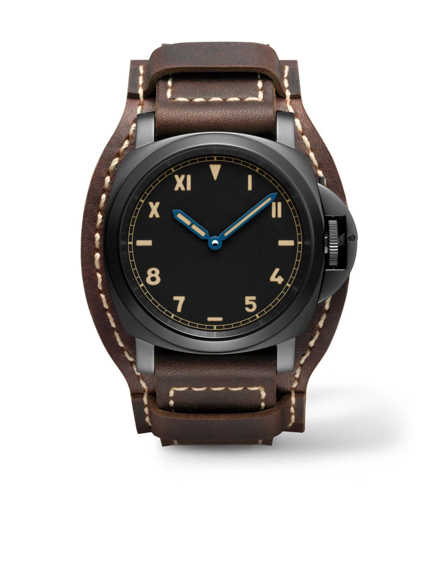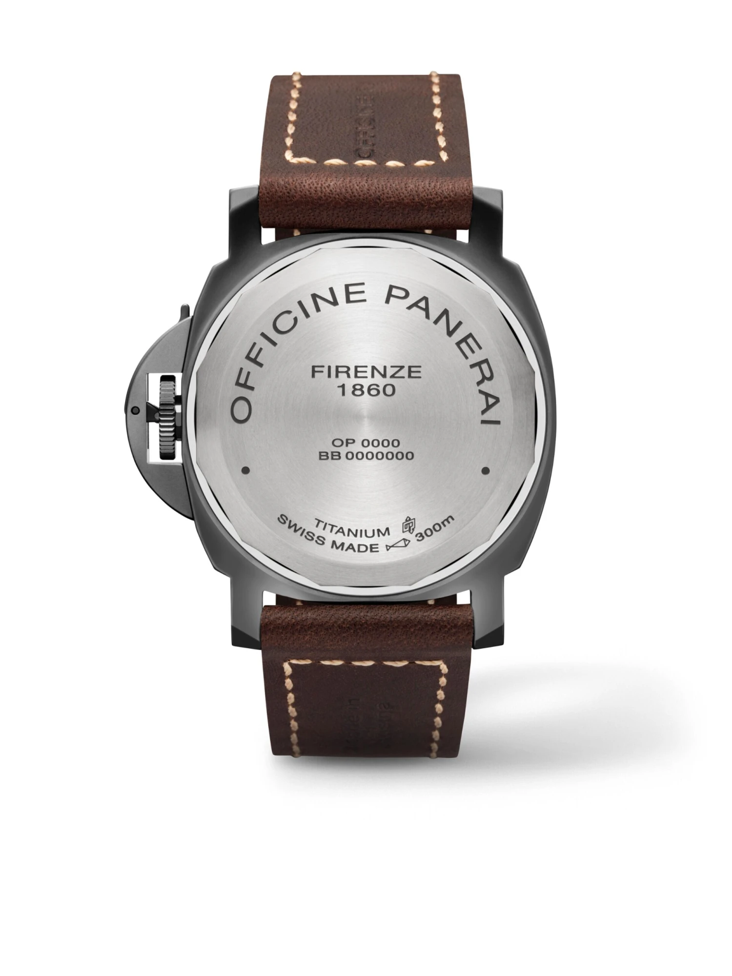 The Luminor California 8 Days DLC – 44 mm, reference PAM00779, offers a rare, historical feature: the “California” dial, sporting both Arabic as well as Roman numerals. This type of display was widespread among military watches in the 1940s to make reading the time intuitive in extreme situations. Powering the two-hand watch is a hand-wound P.5000 caliber with an eight-day power reserve. Protecting the manufacture movement is a 44-millimeter case made of scratchproof titanium with a DLC coating, which is water-resistant up to 30 bar thanks to the characteristic crown protector. The leather cuff strap underscores the expressive vintage nature of the Luminor California 8 Days DLC – 44 mm.