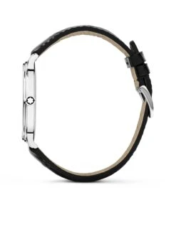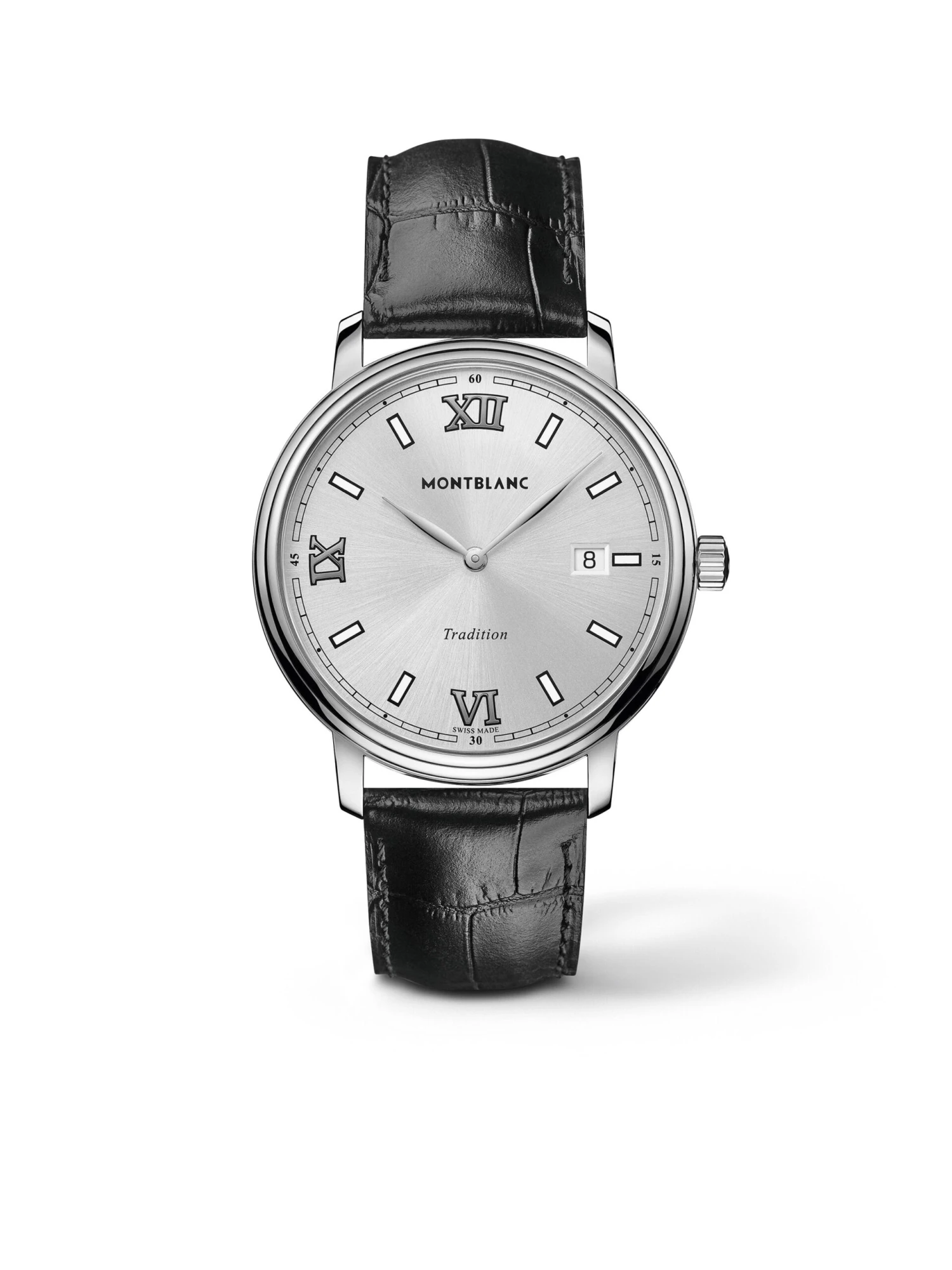 The Tradition Quartz Date is a classic watch in every regard. The 40-millimeter case features the characteristic Montblanc horns and two-stage bezel. The silver-white dial with rhodium-plated Roman numerals, white hour markers, and railroad minute scale is crowned by classic feuille and baton hands. A black calfskin strap with a crocodile skin effect rounds off the plain and elegant design.