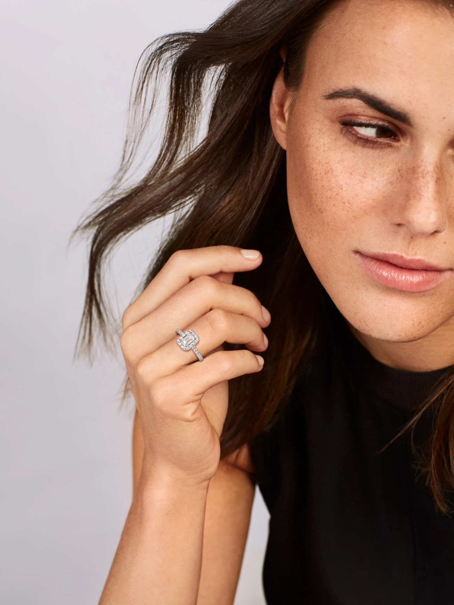 Hardly any other ring could be more suitable than the One Halo by Wempe Classics ring for that decisive moment in life. Set in precious platinum, an emerald-cut diamond of 0.80 ct is surrounded by a halo of smaller brilliant-cut diamonds. The ring band is also set with brilliant-cut diamonds and perfectly suited to be accompanied by an eternity ring.