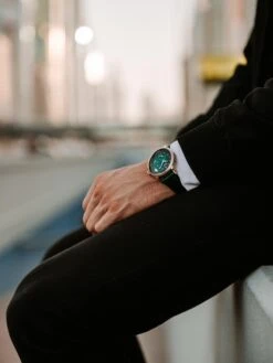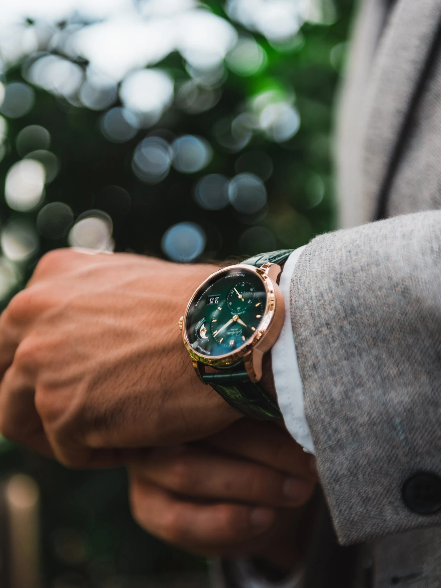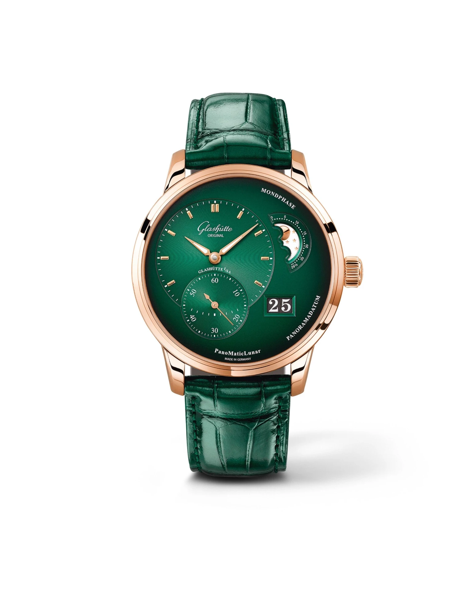 In addition to a decentralized hour and minute display, decentralized small seconds subdial, and the date indicator in the panorama window, the PanoMaticLunar (Ref. 1-90-02-23-35-30) also features one of the most beautiful complications, the moon phase, on its shiny green dégradé dial. In the crescent-shaped window, you can see the spectacle of a waxing and waning moon during a cycle lasting 29.53 days. This and the other functions are driven by the in-house self-winding movement 90-2 in a 40 millimeter large and 12.7 millimeter high 18k rose gold case.