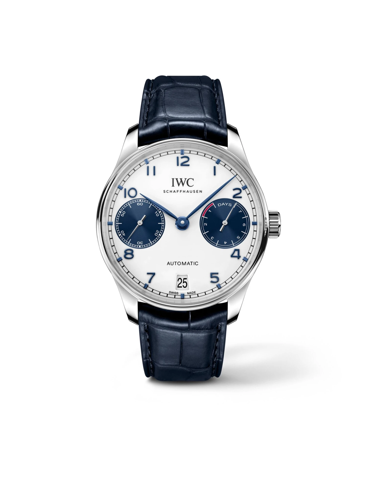 The railroad minute markers, Arabic numerals, feuille hands: No other model so expressively expresses the unmistakable stylistic features of the line as the Portugieser Automatic (Ref. IW500715). But the watch with a brilliant white dial is not only a winner in terms of looks: The winding pawls, the automatic wheel and the oscillating weight bearing of the Pellaton winding mechanism in self-winding caliber 52010 are made of particularly wear-resistant ceramic. Two barrels provide a power reserve of seven days, the current status of which is indicated at three o’clock. The timepiece appears in a stainless steel case with a diameter of 42.3 and a height of 14.2 millimeters and is fitted on a blue alligator-skin strap.