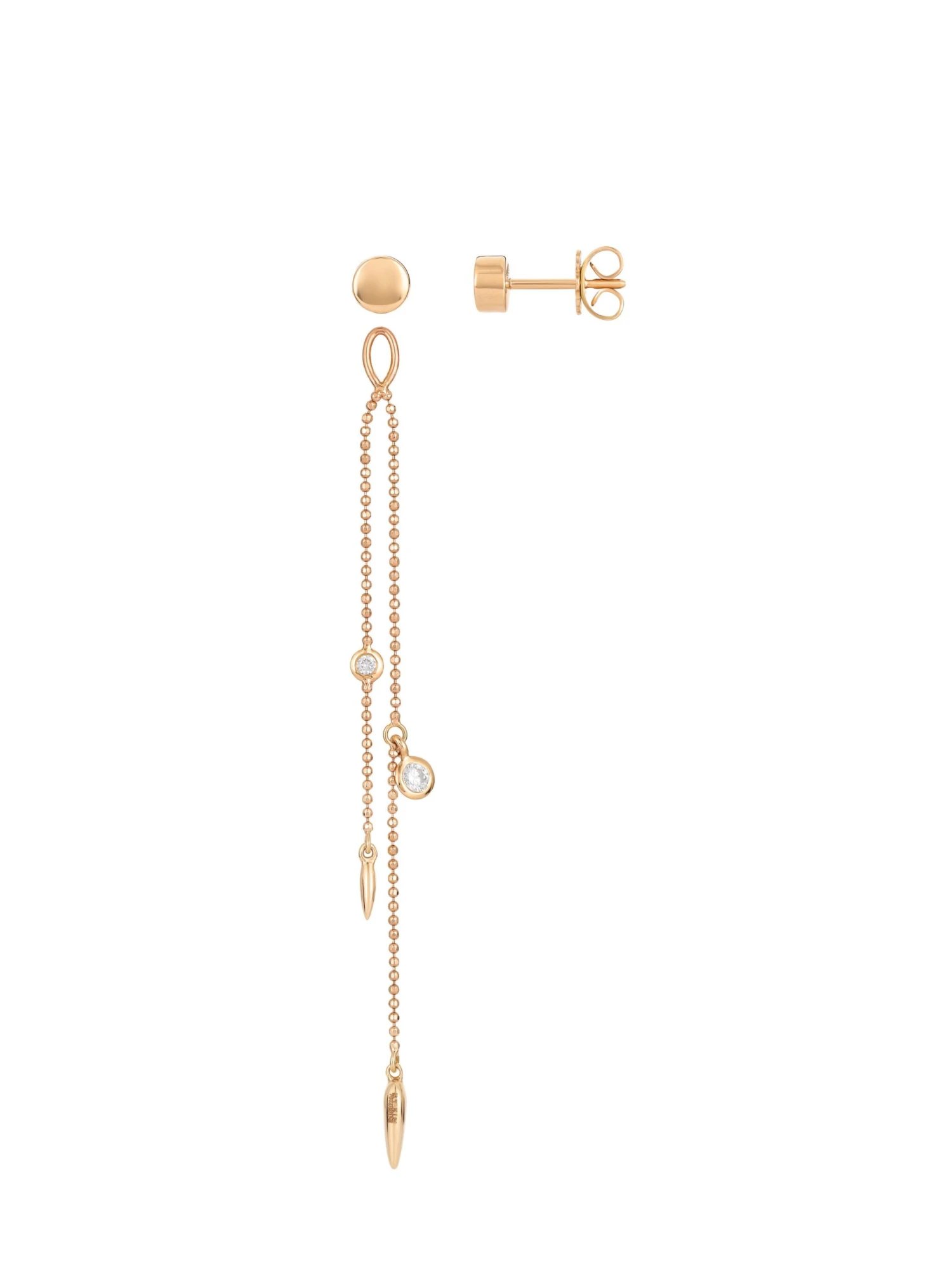 Ear studs by day, pendant earrings by night – these pieces of jewelry from the Puntino BY KIM line are an all-round talent. The idea behind them: These classic brilliant-cut diamond studs can be individually complemented with a pendant chain with beautiful diamond details. A new look in next to no time: These 18k rose gold ear studs are ideal for those who want a different look every day.