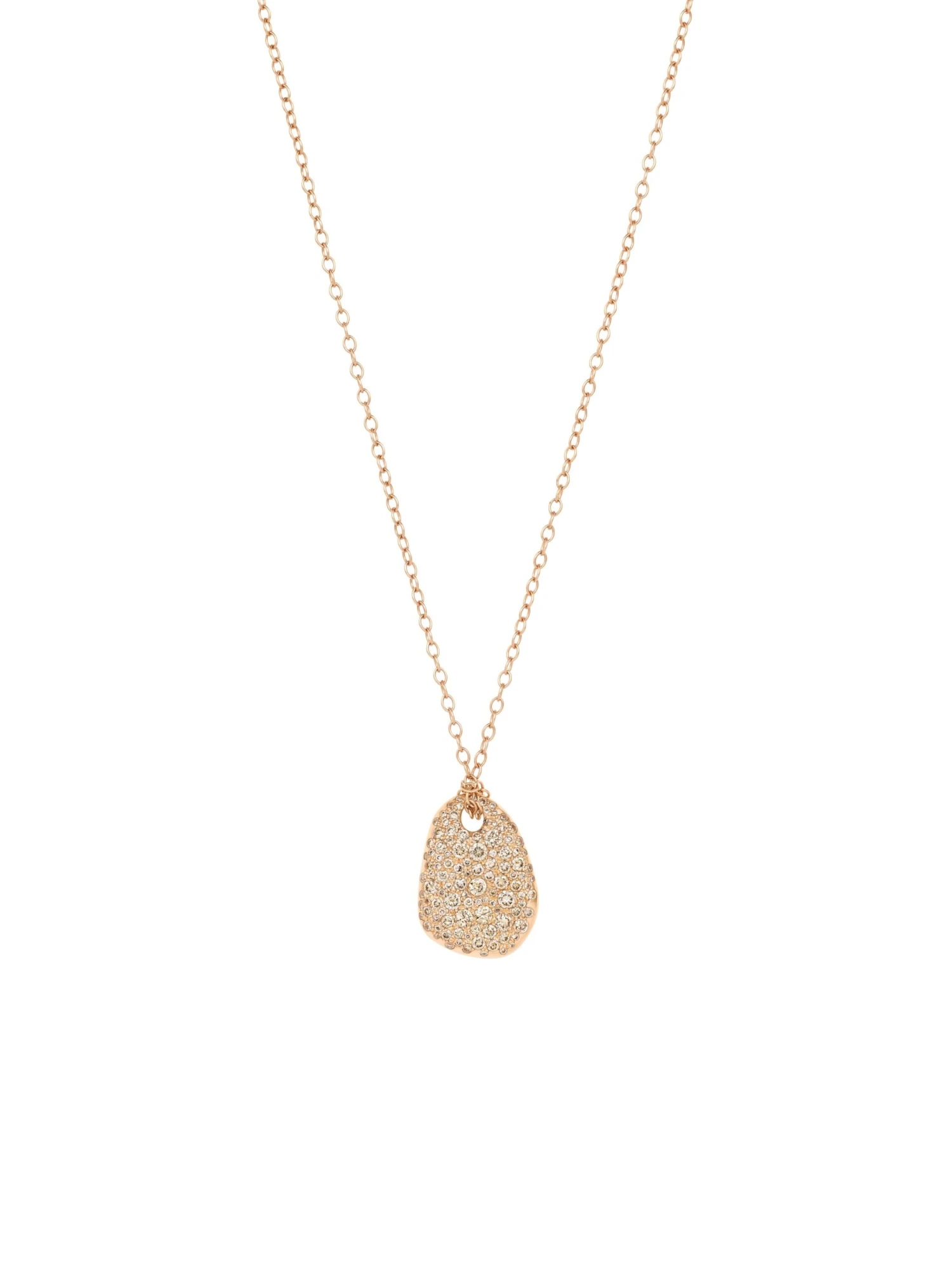 The Cosmos BY KIM pendant in 18k rose gold caresses your skin and feels lovely in your hand. It has everything that it takes to become a perfect talisman. Its front side is encrusted with 114 cinnamon-colored brilliant-cut diamonds of 1.42 ct in total in an elaborate rocky setting that brings to the fore the pendant’s organic beauty. The delicate 55-centimeter trace necklace adds a casual touch.